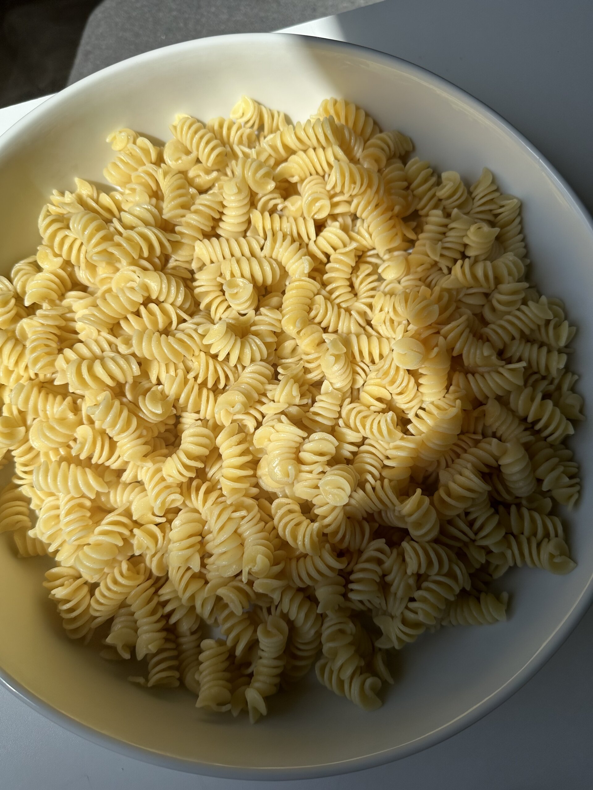 Start by cooking your pasta according to package instructions until al dente. Drain and rinse with cold water to cool it completely. While the pasta cooks, fry the bacon until crispy, then drain and crumble it.