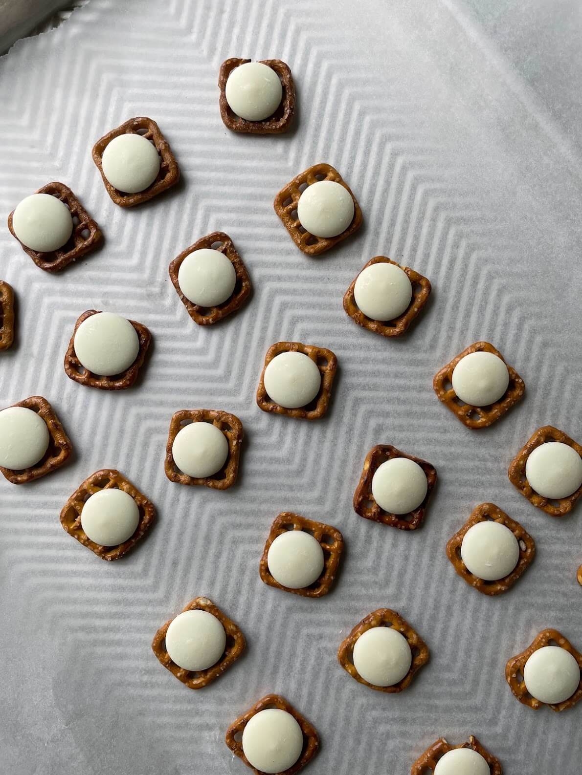 • Add pretzels and top with white chocolate wafer