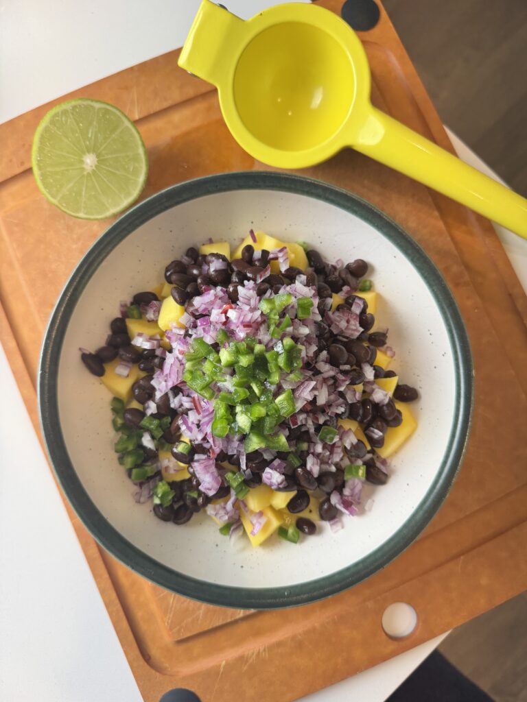 Start by preparing the mango salsa. Dice the mangoes and place them in a bowl with the drained black beans, red onion, diced jalapeño, lime juice, and salt. Toss everything together and set aside so the flavors can meld.