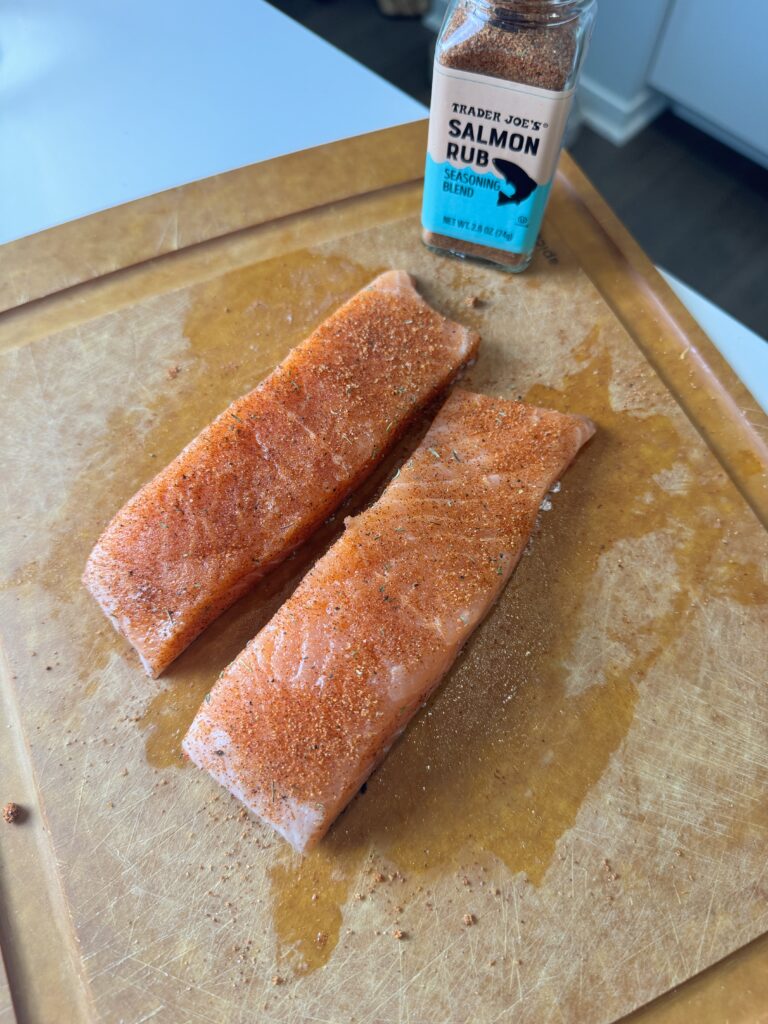 - Pat the salmon dry and rub each piece with the salmon seasoning.