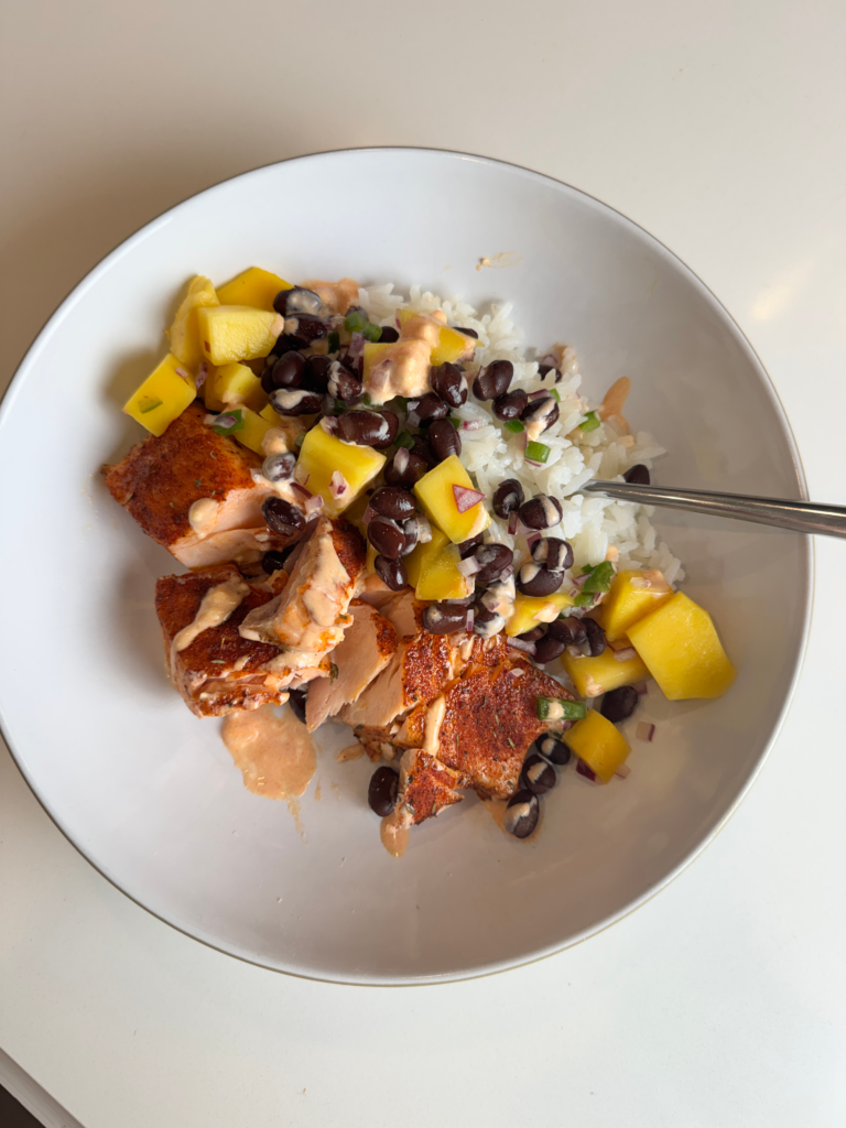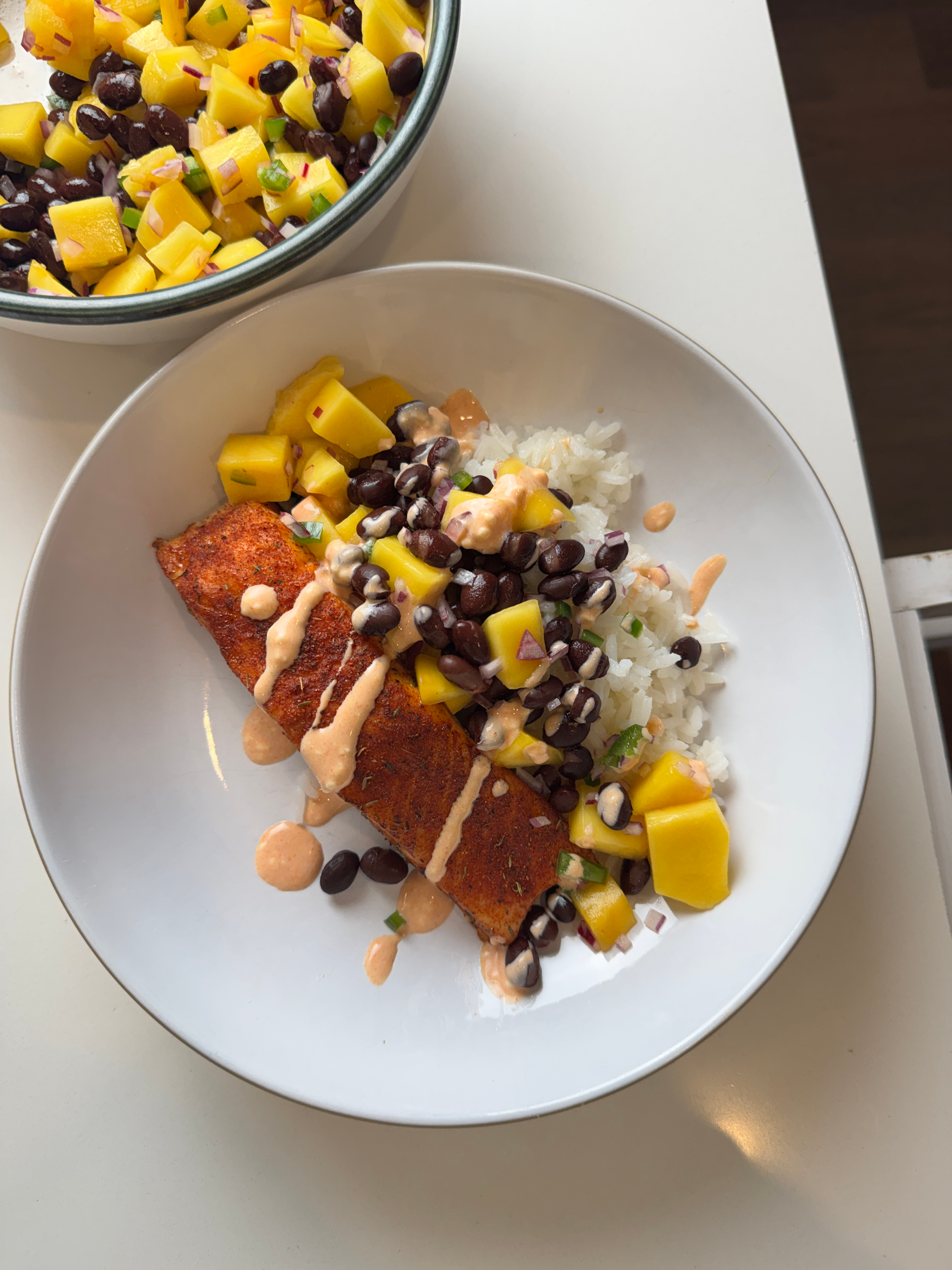 Once the salmon is cooked, simply assemble your bowls with rice, mango salsa, salmon, and optional toppings like avocado or spicy mayo for a colorful, fresh dinner that tastes like it came from a restaurant. The result is a colorful bowl packed with flavor, texture, and nutrition.