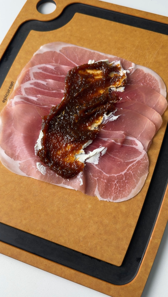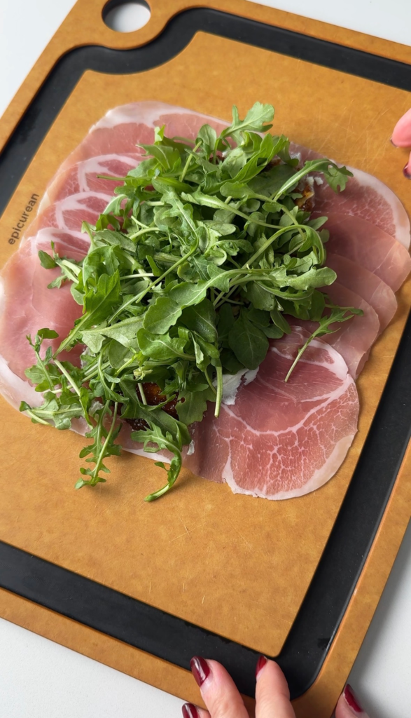 This is one of those recipes that looks impressive on a platter but secretly takes just minutes to make. Creamy goat cheese, sweet fig jam, and salty prosciutto are already a dream combination—but adding fresh arugula brings a peppery bite, and a drizzle of hot honey ties everything together with a sweet heat that makes each bite unforgettable. I’ve also made these in the summer with fresh peaches and OH BABY. I’ll be sharing that recipe shortly too, so stay tuned.