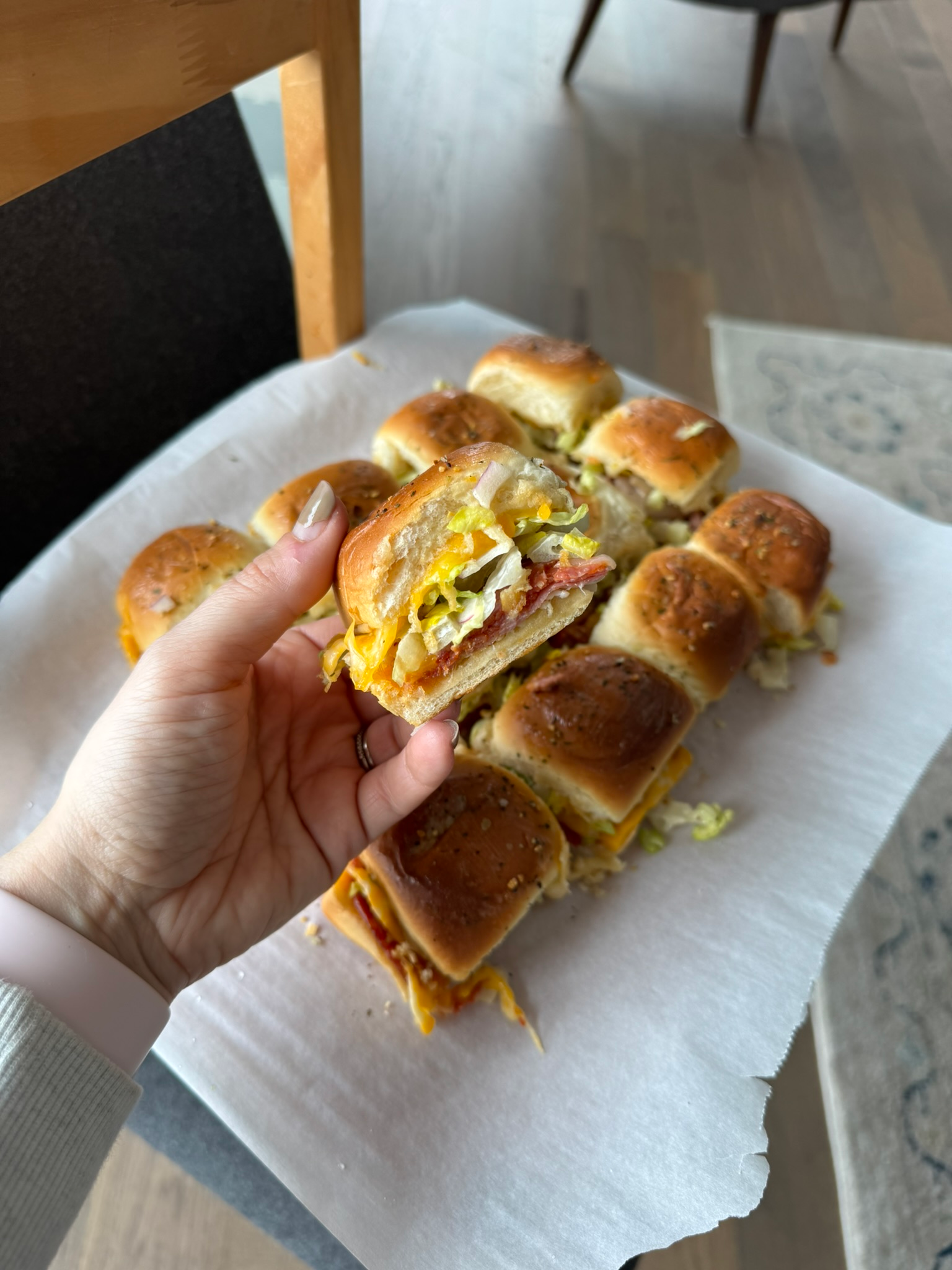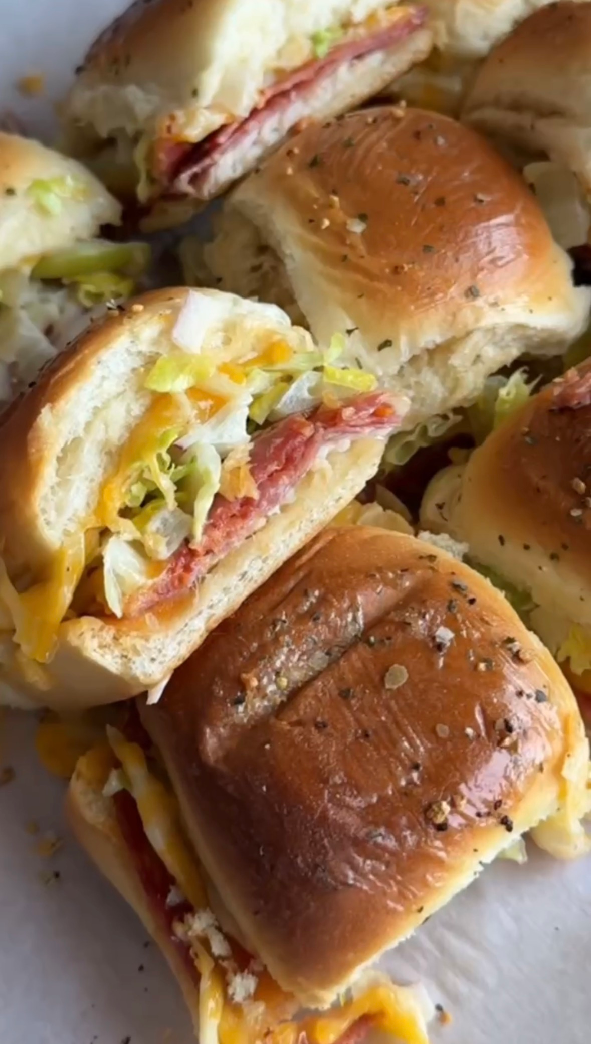 What makes grinder sliders such a hit is the contrast. You’ve got warm, melty, savory sliders paired with a cool, crunchy, zippy salad topping that cuts through the richness. Every bite is balanced, nostalgic, and downright addictive. Every time I make these, the crowd goes wild and they disappear so quickly. I love the combination of melted cheese and deli meats with fresh and tangy lettuce combo. Perfectly spiced and all around delicious.