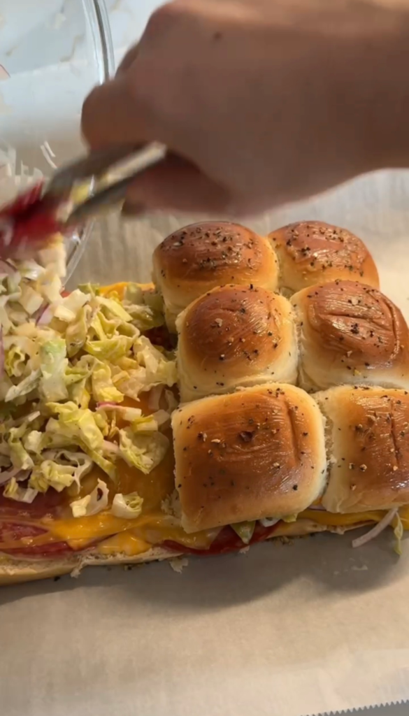 Slice the slider rolls in half and layer with turkey, salami, and cheese. Bake until the cheese is melted and the sliders are warm. While they bake, toss shredded lettuce, red onion, mayo, vinegar, pepperoncini, juice, and seasonings to create the grinder salad. Spoon the salad generously over the warm sliders, add the top buns, slice, and serve.