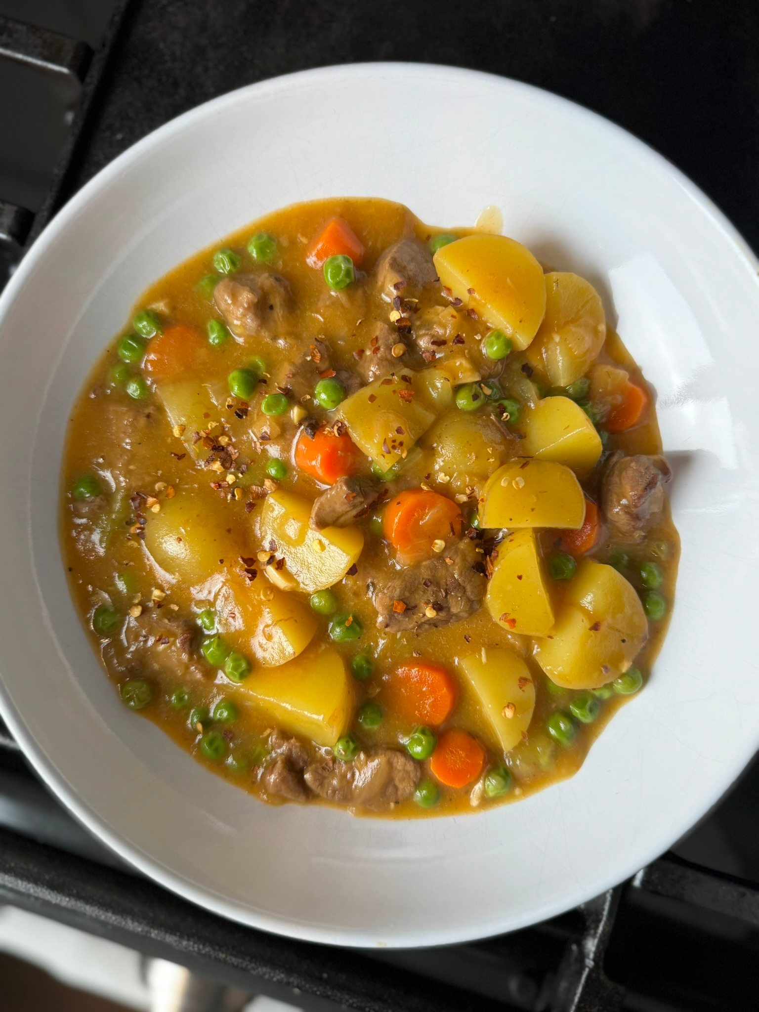 • Once the peas are cooked, the stew is ready! Serve with crusty bread and a sprinkle of chili flakes
