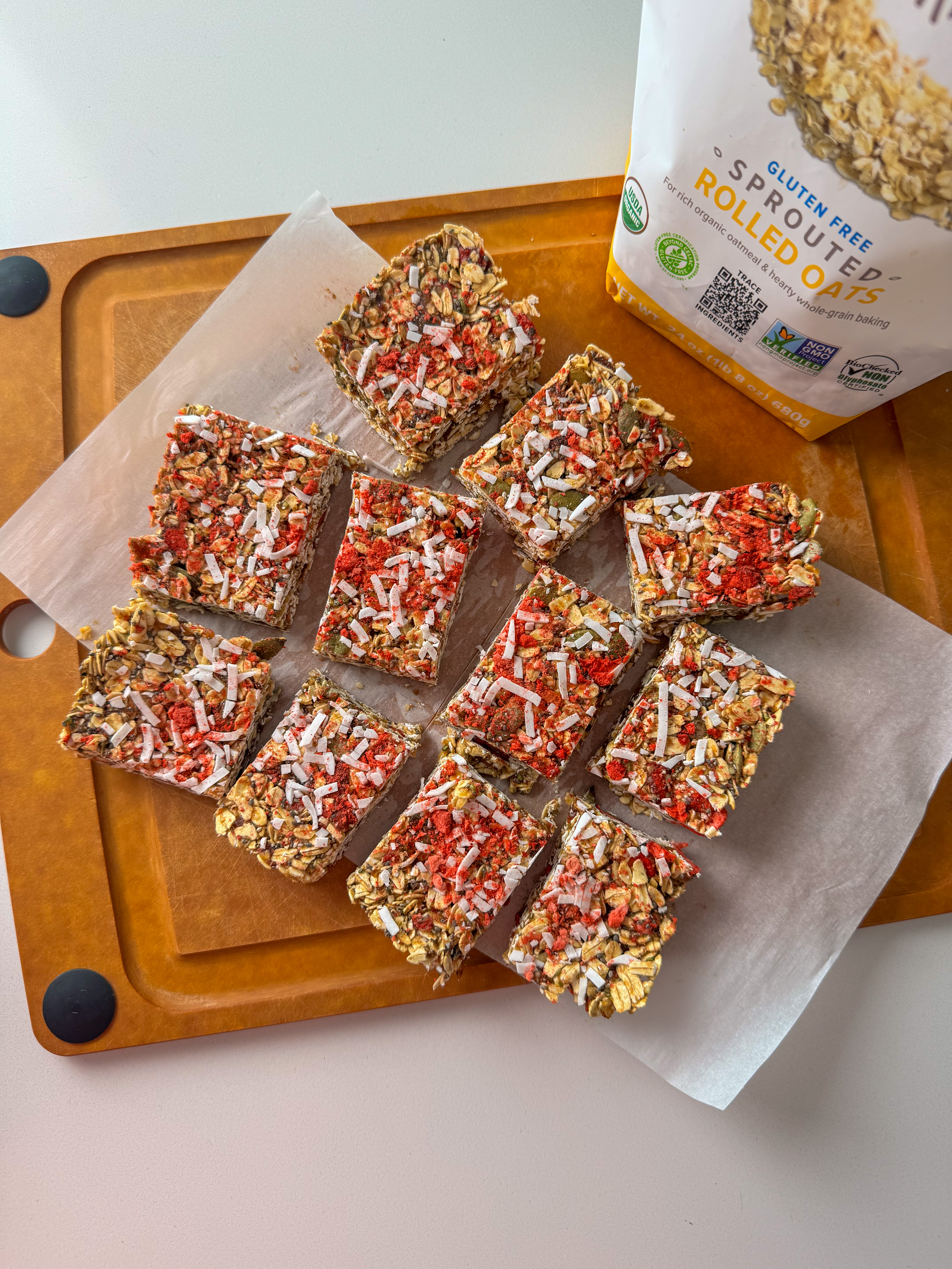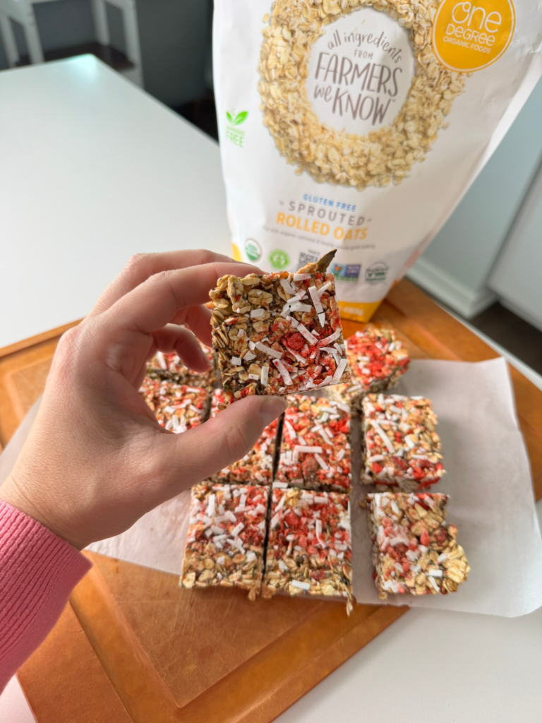 I am SO excited to be partnering with my favorite oat brand One Degree Organics to share this delicious recipe with you. I’ve been using their oats for the last 5+ years so it’s really a dream partnership. Their oats are certified organic, glyphosate free AND gluten free. They are also sprouted grains which means they are easier to digest. Oats are a huge part of our diet because they are packed with nutrients, they are affordable and so versatile (e.g. oatmeal, granola, banana bread etc.) I usually grab a big bag at Costco, so make sure to stock up and try out these yummy bars.