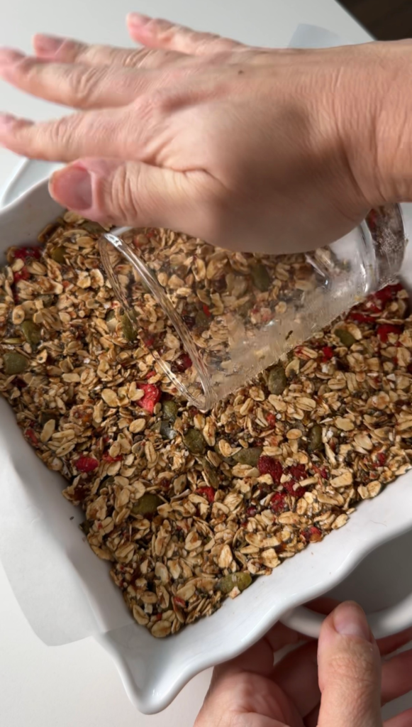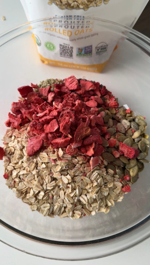 If you’re looking for a wholesome snack that the entire family will love, these healthy no bake strawberry oat bars are it. They’re naturally sweetened, completely vegan, gluten free, nut free, and school-approved — making them perfect for lunchboxes, after-school snacks, or an easy grab-and-go breakfast. My 3 year old LOVED THEM! They have been the perfect snack on the go. A nice break from processed snacks. The freeze dried strawberries are such a perfect addition. They are sweet and a little crunchy and you don’t have to worry about fresh strawberries going bad. We love to have a bag stocked in the pantry at all times.