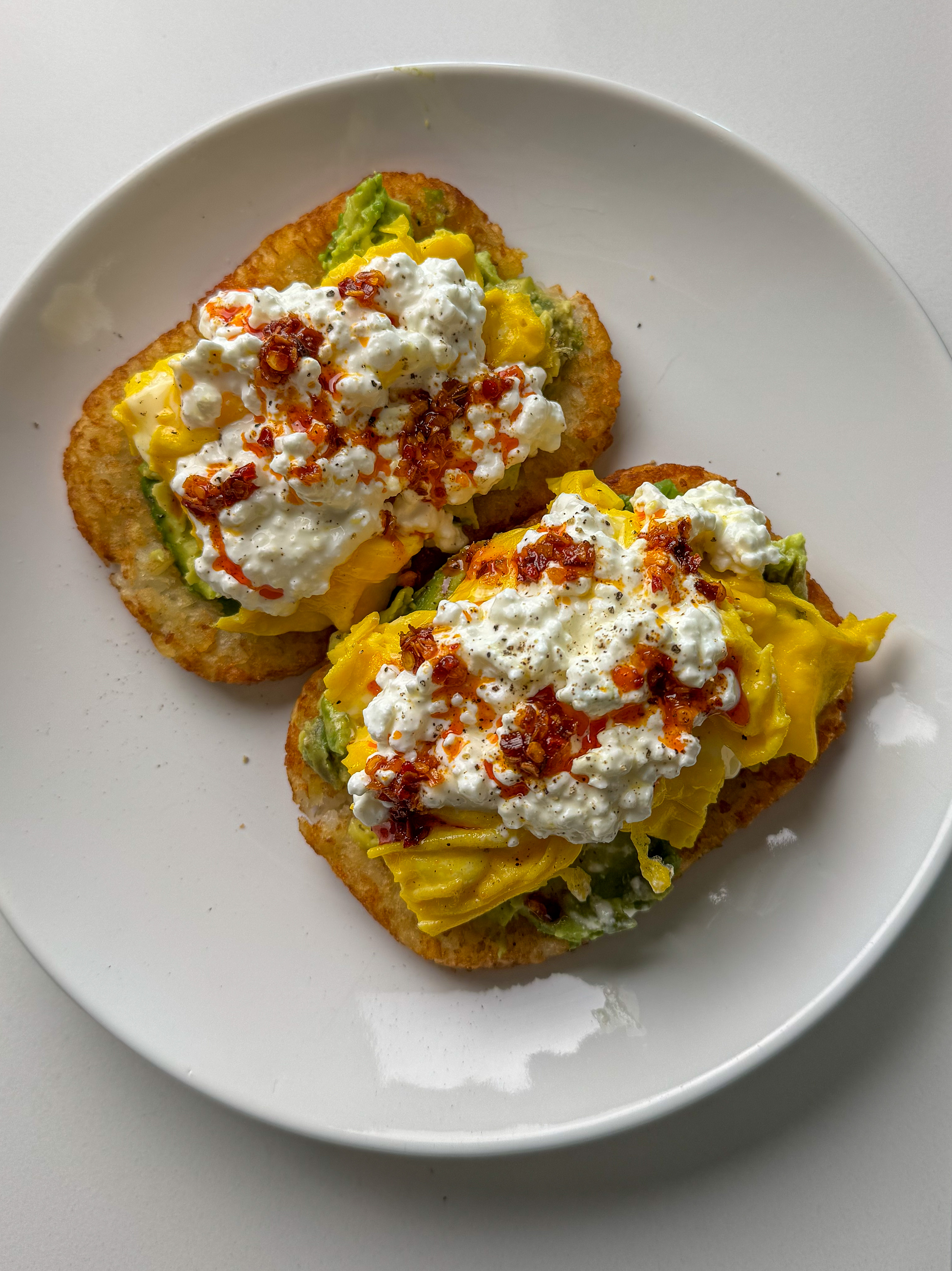 Crispy hashbrowns act as the base, topped with creamy cottage cheese, perfectly cooked eggs, buttery avocado, and a drizzle of chili oil for a little heat. It’s the perfect balance of textures and flavors: crispy, creamy, rich, and slightly spicy. Even better? It’s naturally gluten-free and comes together in minutes.