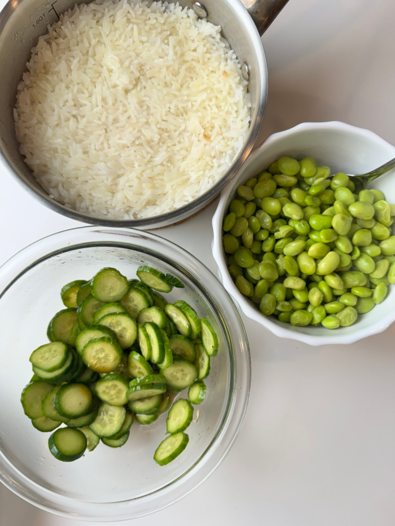 • Assemble bowls with rice, marinated cucumbers, edamame and salmon
