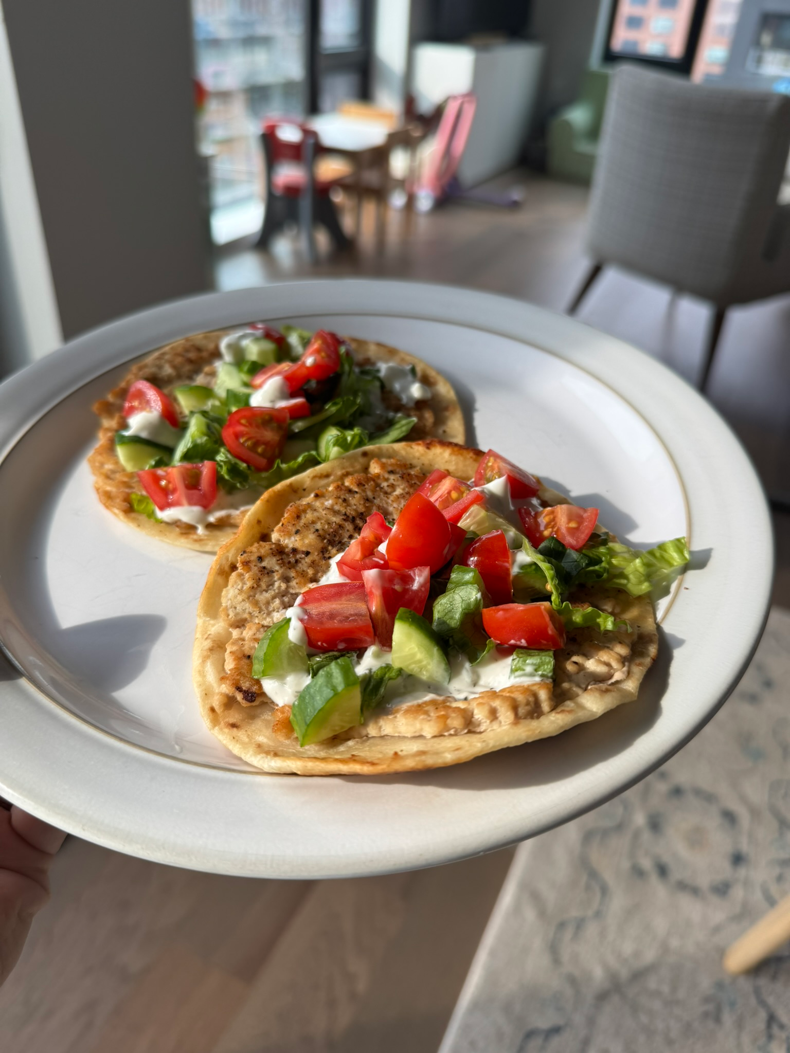 The perfect recipe for warmer days when you want something a little refreshing and light but still packed with protein. If you’re nervous about the chicken fully cooking through, you’re not alone but I am here to ASSURE YOU it does get cooked through. You are adding a thin layer so it cooks quickly. I have used this method is several recipes and it’s always delicious and satisfying. My toddler loves them too because the meat sticks to the tortilla creating an easy hand held dinner. You can switch up the toppings but keep the base the same to make some many fun variations like chicken caesar, buffalo chicken, mcchicken copy cat etc!