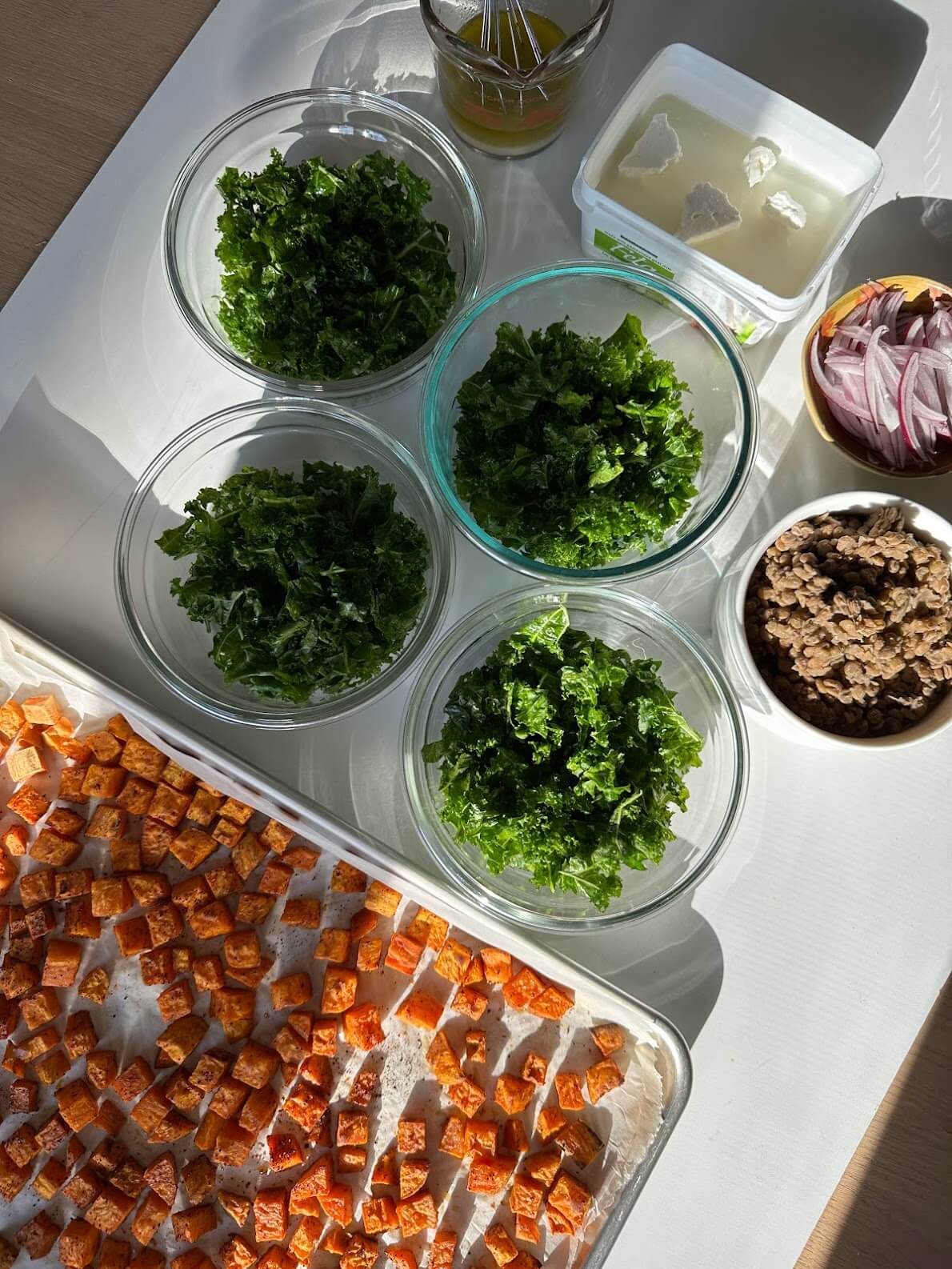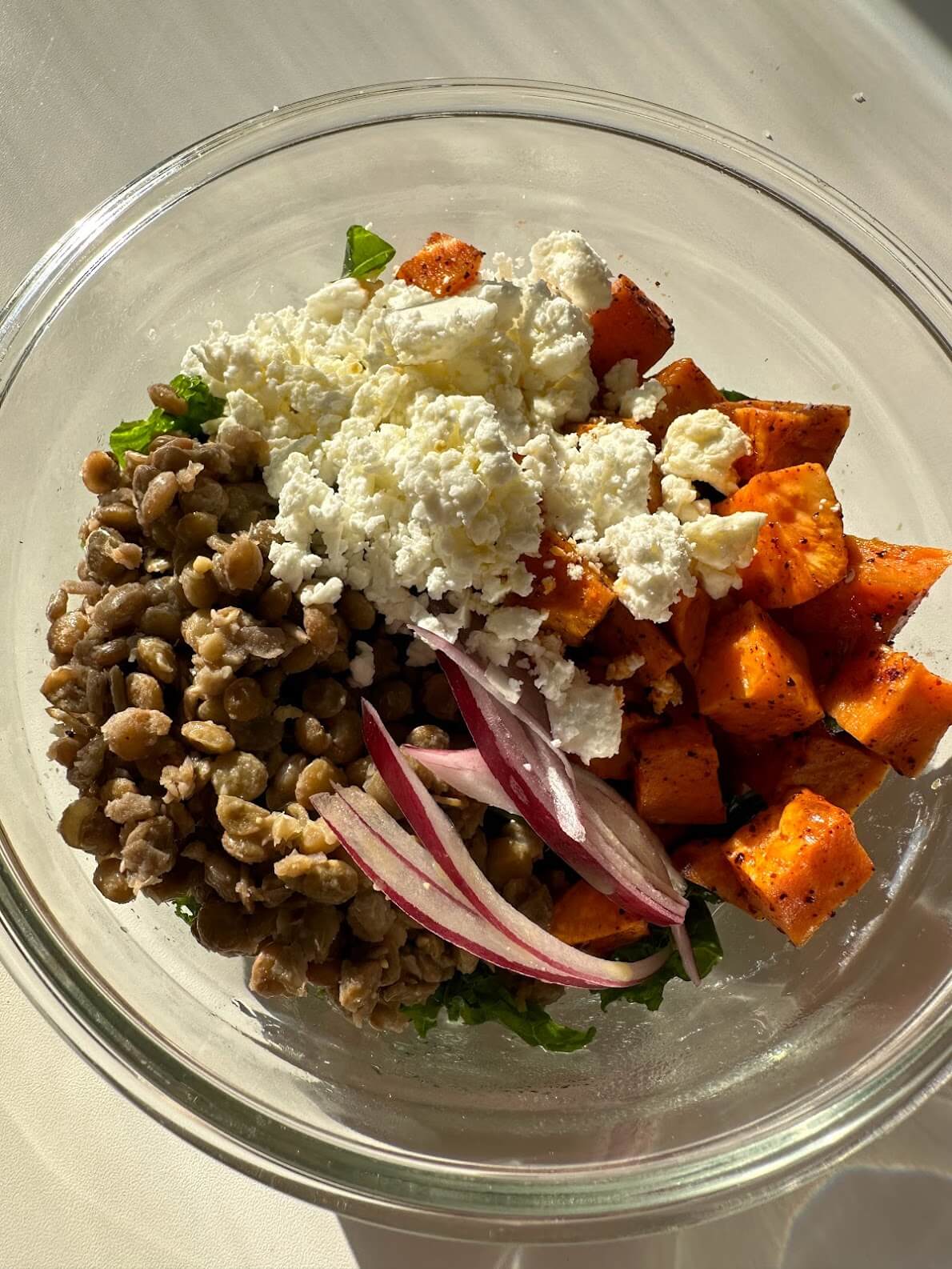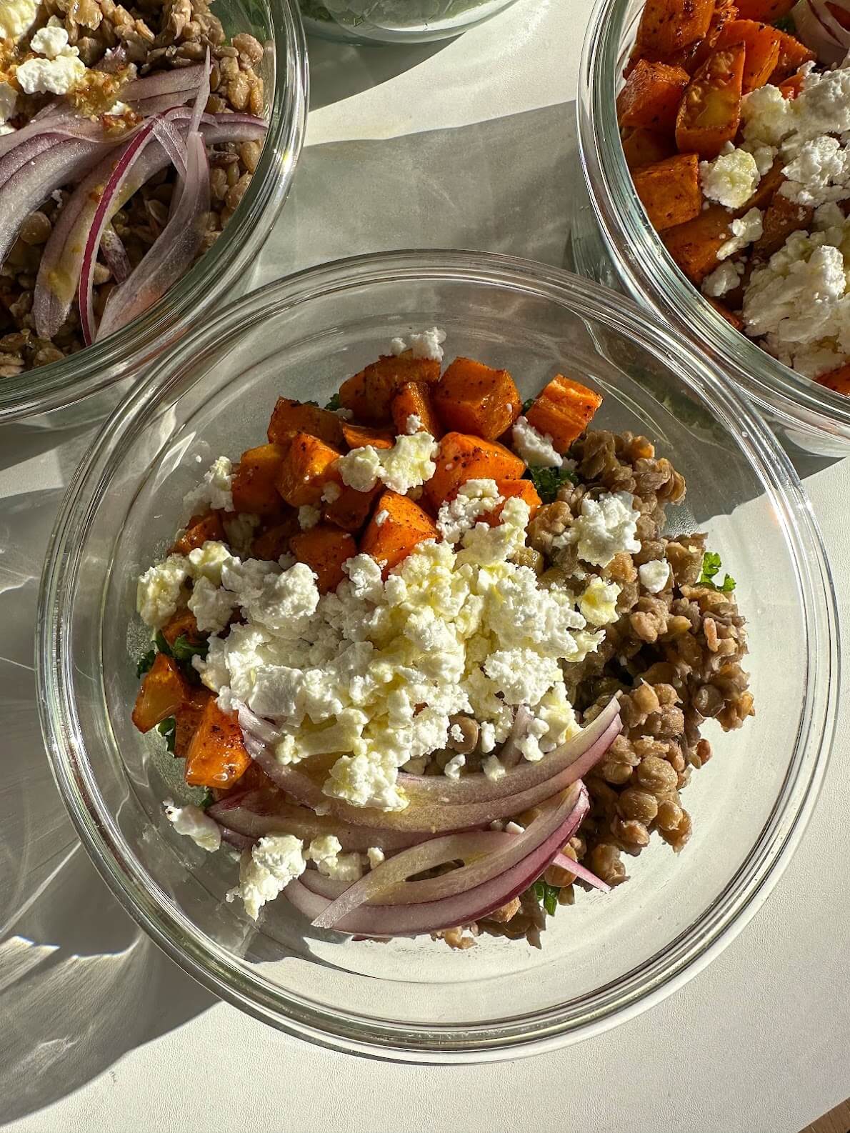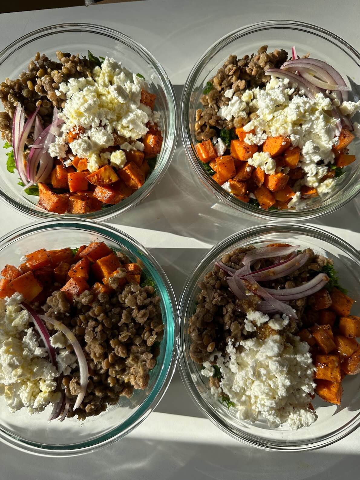 • Assemble bowls by adding kale, sweet potatoes, lentils, and red onion to each bowl. Top with crumbled feta and drizzle with dressing