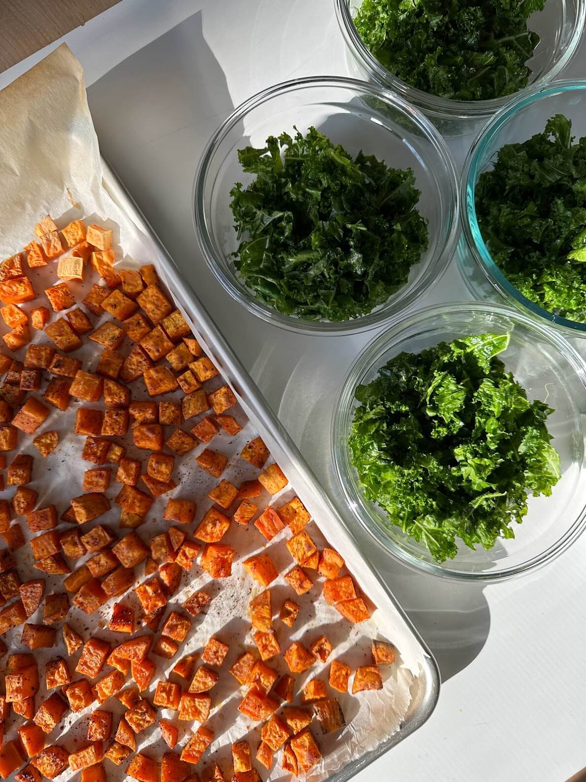 Olive oil is used for roasting the sweet potatoes and kale, as well as in the salad dressing, adding richness and healthy fats.